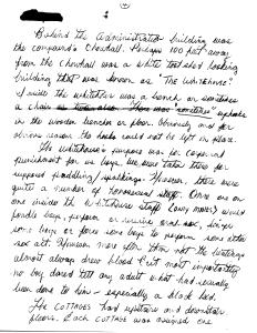Every so often we would be told that some โran awayโ (a.k.a. escaped) but the only boy that I know to be found and brought back is a homosexual about 13 years old, who had knocked himself out by running into one of the pine trees, in the dark, about the tree line. When one of our fellow disappeared for any reason we were strongly discouraged and urged not to ask questions. PERIOD.